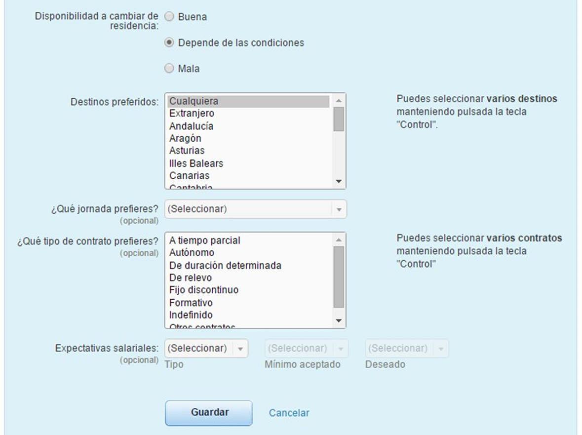 number 6 Disponibilidad a cambiar de residencia: Deja siempre sin cumplimentar este apartado o selecciona “depende de las condiciones”. Algunas empresas requieren de un periodo de formación previo que habitualmente suele realizarse en un centro de trabajo diferente al ofertado.