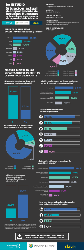 En el presente estudio, elaborado por Etrania Human Resources & Training con la colaboración de Wolters Kluwer y el Excelentísimo Colegio Oficial de Graduados Sociales de Alicante, podrás encontrar un completo diagnóstico de la situación actual de los departamentos de Recursos Humanos en la mediana y gran empresa de la provincia de Alicante.