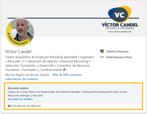 Esta opción esta principalmente dirigida a profesionales en activo, abiertos a una nueva oportunidad laboral pero que no desean que todos los miembros de LinkedIn o que sus empresas sean conocedoras de que están buscando un cambio, de ahí que sólo sea visible a técnicos de selección.