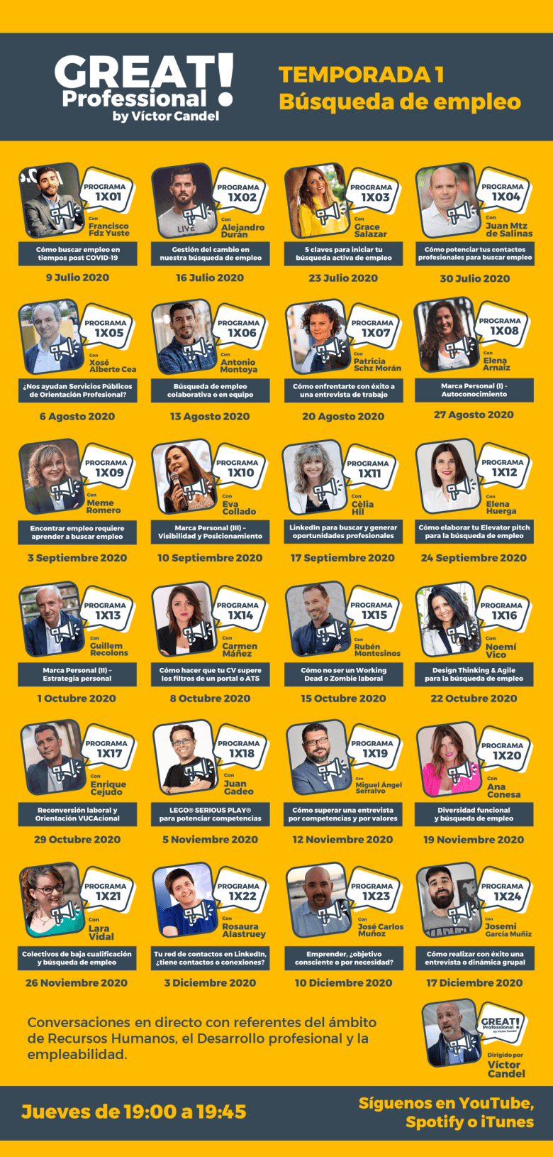 GREAT PROFESSIONAL es un programa en directo de 45 minutos de duración a través de YouTube, donde todos los jueves a las 19:00 tendrás la posibilidad de conocer a referentes del ámbito de los Recursos Humanos, el Desarrollo Profesional o la Empleabilidad.